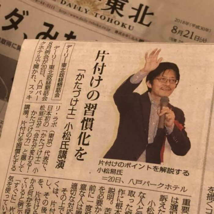2018年8月21日(火)デーリー東北政経懇話会講演の様子を掲載いただきました <片付けの習慣化を> 「かたづけ士」小松氏講演 デーリー東北政経文化懇話会の8月例会が20日、八戸パークホテルで開かれ、スッキリ・ラボ(東京 […]