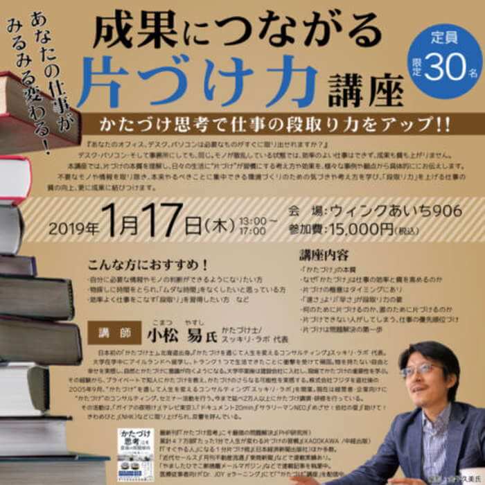 「成果につながる 片づけ力講座」 日時:2019/01/17(木)13:00~17:00 会場:ウインクあいち906 住所:名古屋市中村区名駅4-4-38 参加費:15,000円(税込) 定員:30名 『あなたのオフィス […]